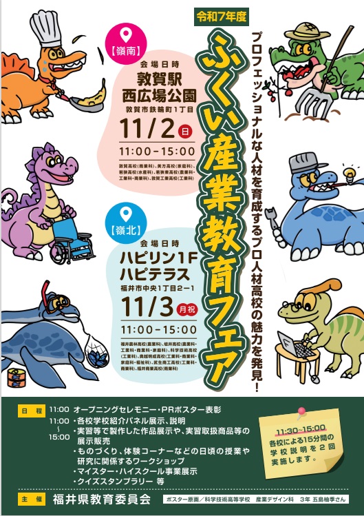 2025年10月23日 / 最終更新日時 : 2025年10月23日 cmsadmin27 新着情報 ふくい産業教育フェア 11月3日(月)午前11時から、ハピテラスにて「ふくい産業教育フェア」が開催されます。職業系の高校が、学校での活動の取り組みの紹介や、ワークショップなどを通して、各学校の魅力を発信します。福井商業高校のブースでは、学校紹介の他に、「クリアランスの取り組み紹介」、「簿記って楽しい!ワークショップ」「福商生なりきり顔出しパネル」「恐竜型箸置きガチャポン販売」「イノルラ販売」などを予定しています。みなさんのご来場をお待ちしています。