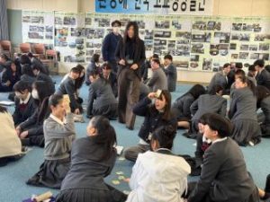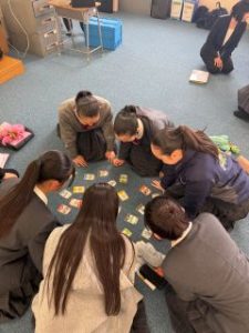 前半は、協力型ボードゲーム「ふくい温暖化クライシス」を体験。企業の方がファシリテーターとなり、読み上げる「2つのヒント」を頼りに関連するカードを素早く取る「かるた形式」のワークを行いました。教室内には「それだ!」「こっちじゃない?」といった声が飛び交い、まるで大会のような盛り上がりに!単に知識を暗記するのではなく、遊びの要素を通じて、温暖化対策に必要な具体的なアクションを楽しく学ぶことができました。